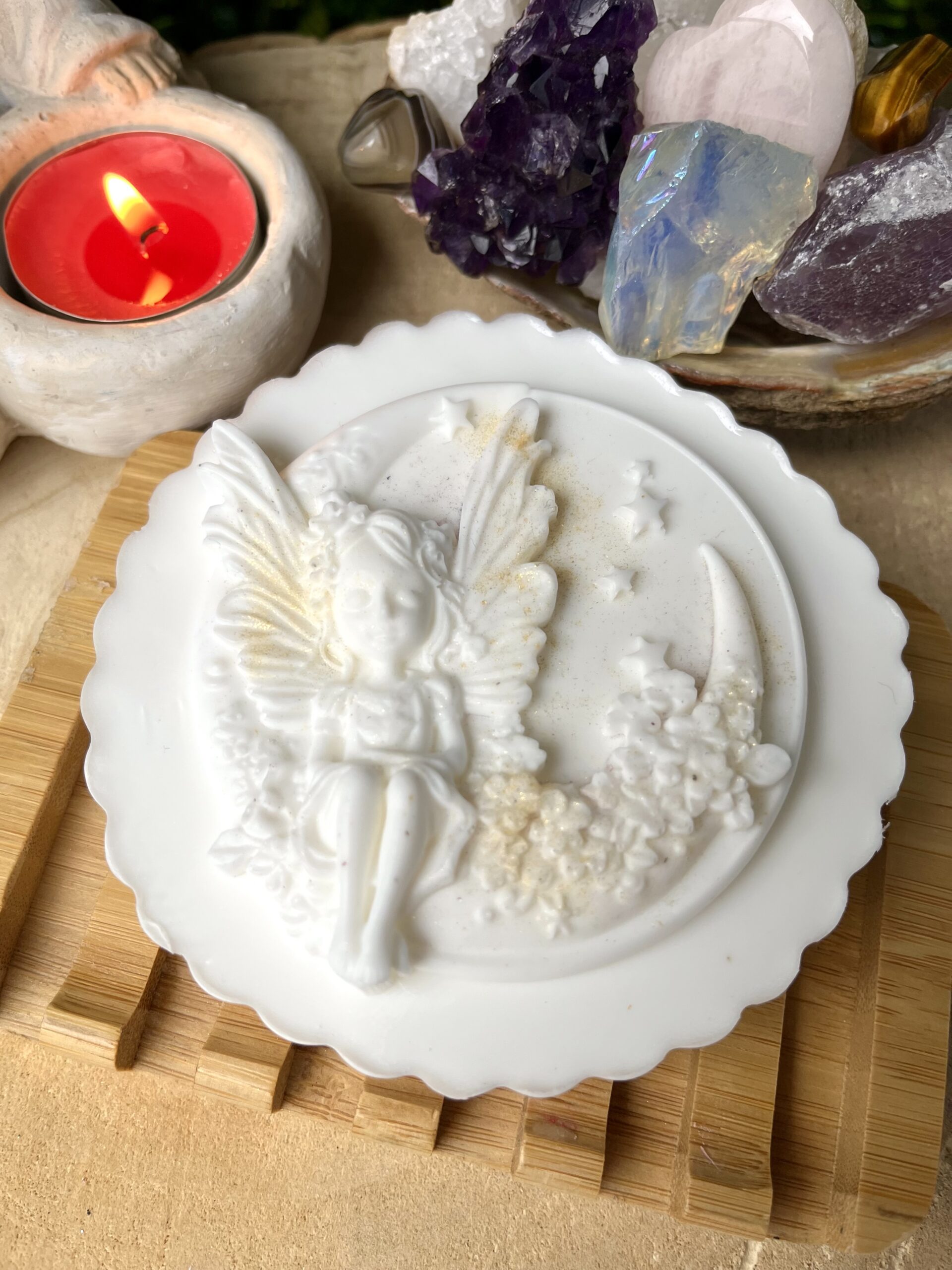 Okrągła forma mydła symbolizuje pełnię, ochronę i równowagę. Wzór z wróżką i księżycem przypomina, że światło i dobro wracają do nas, a złoty pył przyciąga pozytywne wydarzenia i energię. To ręcznie wykonany produkt, który łączy estetykę z głębokim przesłaniem.