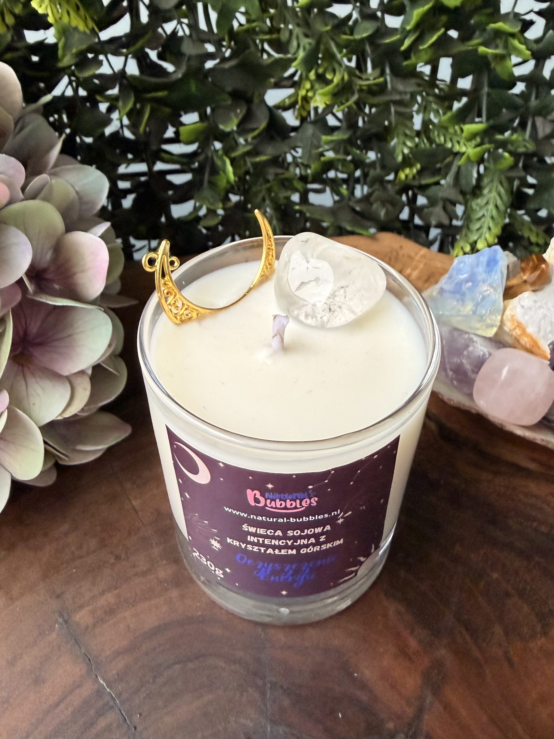 - Unikalny design: kryształ górski i symbol księżyca na górze świecy dodają estetyki i funkcji energetycznych.